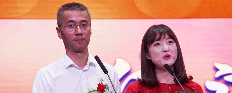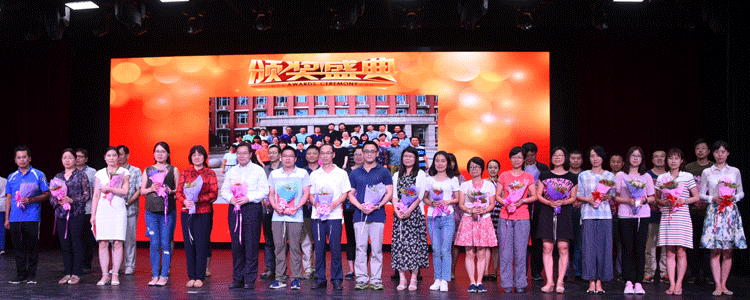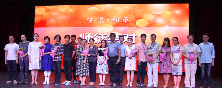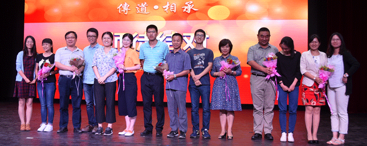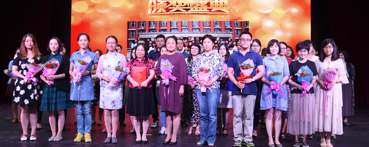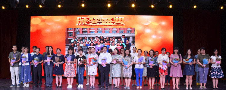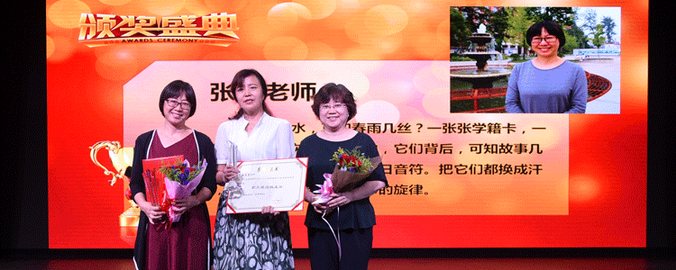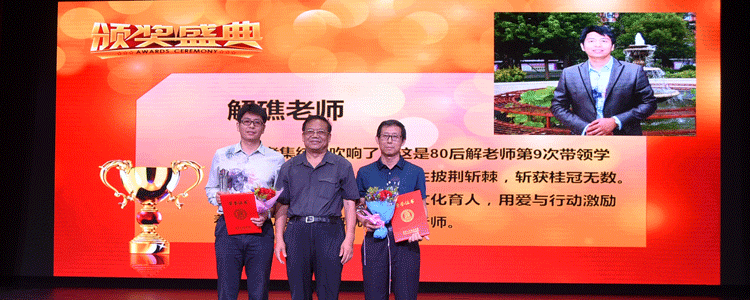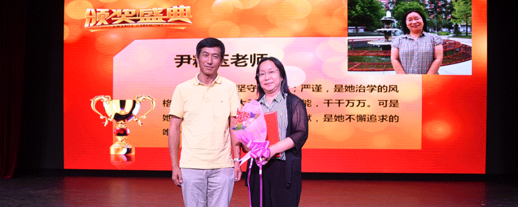 朱亮、唐洁老师主持接下来的年度颁奖盛典。颁奖盛典表彰了本年度国际、全国、北京市获奖集体和个人代表、优秀共产党员与先进党支部、“厚德杯优秀班主任”和“学生最喜爱的班主任”。在师徒结对环节,年轻教师为教育教学师傅献花,表达了谢意。