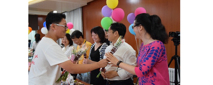 英语组教师为师傅王英民老师(中)献花