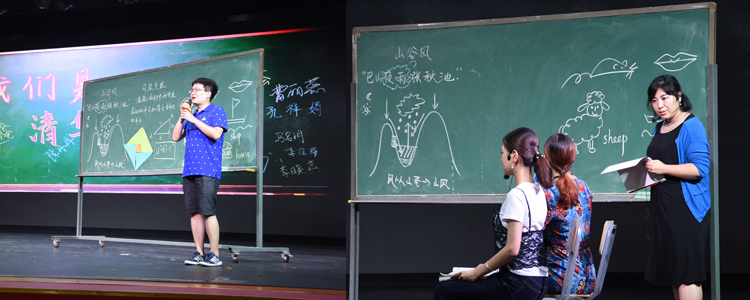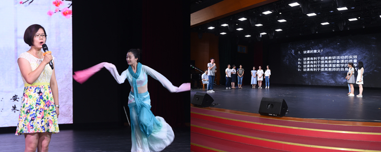 在教学技能展示环节,说课技巧组、教学设计组、板书设计组、课件设计组共同展示了新教师们的教学基本功。说课技巧组通过知识抢答比赛的形式,展示了说课的流程、重点与说课技巧,内容详实丰富,形式活泼生动。教学设计组通过模拟课堂《诗经•采薇》,形象地展示了教育教学过程中,如何采用别具匠心的课堂设计,让课堂富于启发性和趣味性。板书设计组通过情景再现的形式,展示了在现代信息技术发达的背景下,传统板书教学所具有的在引导学生思考、激活课堂氛围、应对突发事件等方面的作用。课件设计组通过歌曲改编、模拟教研组开会的形式,展现了课件制作规范与注意事项,探讨了课件与传统板书如何有机融合。