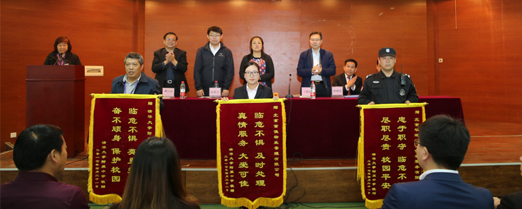 此次大会重点表彰的三个单位和部门分别是北京首佳物业管理有限公司、皇冠体育官网总务办公室、北京华远卫士保安公司。解巨钊介绍了以上三个单位和部门在校园安全方面的先进事迹,方妍宣读了表彰决定,王殿军、方妍、解巨钊三位校领导为他们颁发了锦旗。