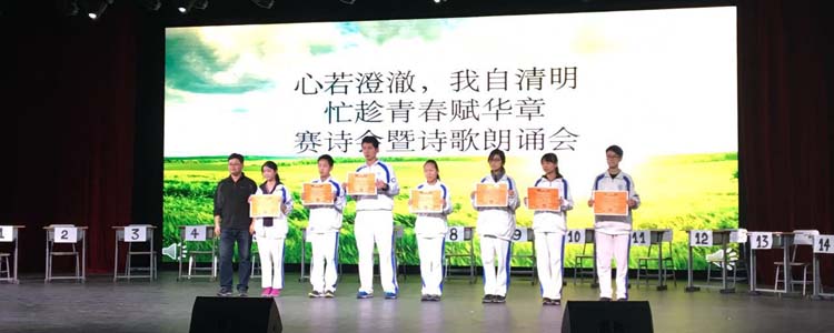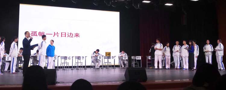 在诗词背诵比赛中,活动以班级为单位,采用随机抽选方式进行,每轮每班抽选一名同学代表班级上台作答。整个活动由笔答、口答、现场诗歌创作颁奖、诗歌朗诵四个部分组成,交叉进行。