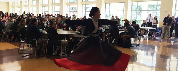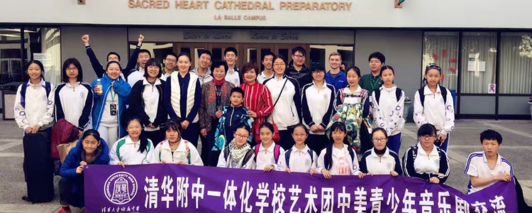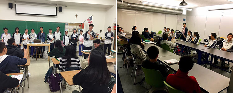 音乐剧学习结束,艺术团于当地时间2月13日走进旧金山SACRED HEART CATHEDRAL PREPARATOPY圣心高中,分组来到课堂与美国学生共同学习中文、数学、化学、物理、表演艺术、宗教艺术、历史、人类性学等课程。同学们积极参与课堂讨论,气氛其乐融融。同时,艺术团的同学们表演的中国特色的合唱和舞蹈节目,收获了雷鸣般的掌声,收获了友谊。