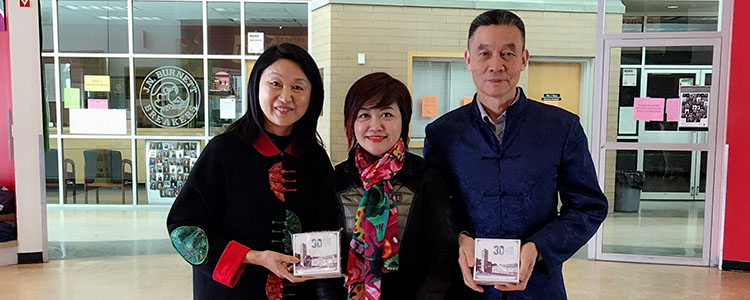 鞠红老师(中)向温哥华北京中文学校校长王志光博士赠送纪念品