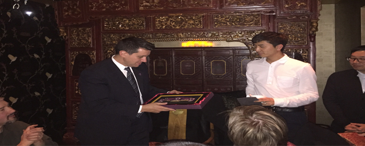 邱楠老师代表皇冠体育官网向托马斯•杰斐逊科技高中校长赠送皇冠体育官网百年校庆纪念品