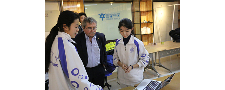然后格奥尔格教授又来到皇冠体育官网创客空间与初中同学进行交流。皇冠体育官网创科中心建设于2013年,那时创客的概念还少有人知,在王殿军校长的支持下,学校在教室紧张的情况下为学生们开辟了200多平方米的空间,让学生们可以把设计变为产品,让梦想成为现实。目前创客空间已经发展成为具有丰富的师资、项目和设备的科技教育平台。