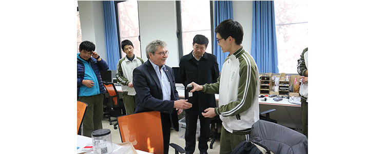 高15级张亦弛同学代表实验室热烈欢迎格奥尔格教授的到来,并为教授简要介绍各个实验室的研究方向。随后格奥尔格教授依次参观能源系统实验室、自动化与机器人实验室、计算机实验室和地理信息实验室。各实验室的同学纷纷为教授介绍自己的研究成果,包括热电陶瓷温差发电装置,太阳能转化系统,电磁减震系统,智能感应床,四轴飞行器,遥感测量技术,VR技术与神经网络深度学习等。格奥尔格教授与同学们亲切沟通,深入了解各个项目并进行评价。