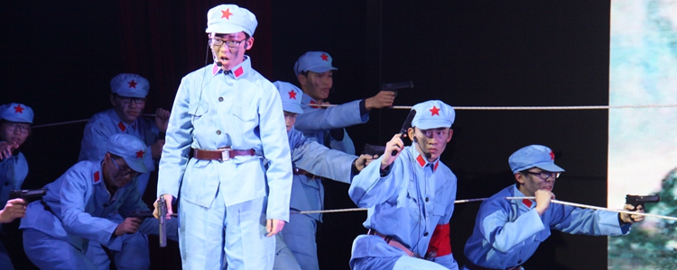 高1607班的主题是“四渡赤水出奇兵”。他们凭借着精彩的剧情和精湛的演技将那巧妙脱围战的惊险展现的淋漓尽致。最后无比逼真的舞台效果绝对是整部剧最大的亮点,令台下观众惊叹连连。
