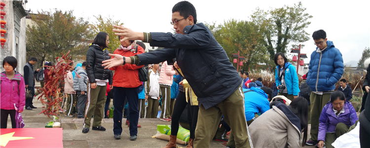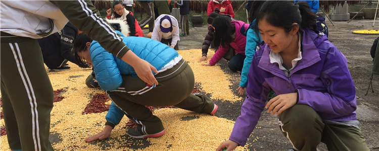 11月11日,兵分三路的安徽师生在呈坎古村汇合,在古村落亲自体验了徽州古老的传统活动“晒秋”。当艳阳的光芒洗涤了整片天空,热情地照耀拥抱着每一个人和每一粒谷物,五、六班的全体同学齐心协力用辣椒、玉米和黄菊摆出了校训中的“自强不息”、二组同学摆出了“厚德载物”、三组同学摆出了“皇冠体育”,当巨大的字呈现在面前时,每个人的心里都欢腾着丰收的喜悦和集体的温暖。与此同时,民间艺术家还在为同学们进行撕纸的表演。