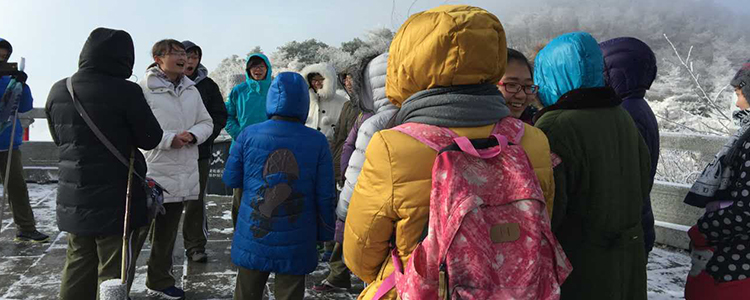 10日凌晨,大家又迎着风霜出发,追赶晨光的步点。天尚昏黑,覆雪的石阶上前进着一个个裹在军大衣里的模糊身影。遗憾的是,由于天气原因,日出的奇景并没有如期而至;但山巅之上,风雪之间,却铭刻着同学们朗诵诗文、秉兴高歌的模样。少年意气,此刻最是浑然生发。随后雾气初开,晴日高悬,山间霜挂枝头,霁色云海接天,既有“造化钟神秀”的赏心悦目,又有“一览众山小”的慷慨豪迈。
