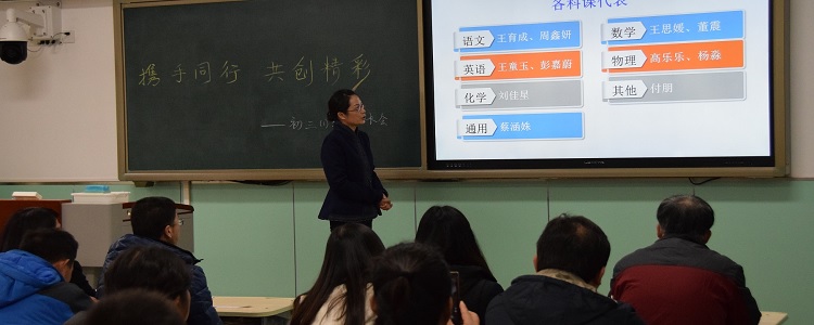 紧接着,程惠云副校长从教师培养、目前的困难、所需的帮助三个方面作了系统的报告。程校长表示,在年轻教师的培养方面,学校做了全方位的工作,聘请了许多特级教师进班听课并对老师进行指导,以促进年轻老师的快速成长。针对学校住宿生较多的客观情况,程校长希望各位家长能够做好表率积极配合学校管理,共同引导孩子遵守学校纪律,以达到健康快乐成长之目的。最后,初三年级助理贺清灿老师从校园生活、课程设置、期中考试、工作计划等几个方面对初三年级的整体情况做了讲解。