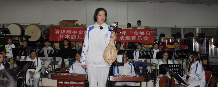 音乐会由胡军老师主持的欢迎仪式开始,之后,胡军老师指挥乐团为日本师生演奏了民乐经典《龙腾虎跃》、《瑶族舞曲》、《丰年祭》等曲目,期间,胡军老师还向来访师生介绍了中国的二胡、琵琶、笛子、唢呐、大鼓、大锣等乐器。