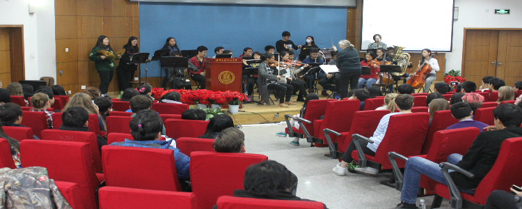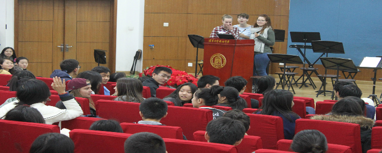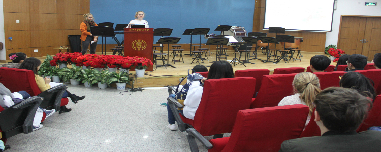午饭过后,高中部的全体师生与到访的德国师生欢聚一堂。会上,德国学生们对德国食物、德国足球及他们的家乡黑森州做了生动详细的介绍。随后,国际部学生们也上台对首都北京做了介绍,并且进行了合唱表演、传统及现代舞表演及有德国学生参与的精彩魔术秀,现场氛围友好而热烈。