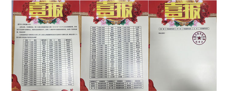获得全国一等奖的选手有:程慧云老师指导的刘卓超、俞惠茜;周喆老师指导的李鹿鸣、王天夫、张思琦、颜澍航、吴思贤、刘佳源、刘云飞、李智、郑若琪、胡泰阁;易春丽老师指导的杨云舒、杨思琪、李明昊、刘玉婧、卫钰杰、文蓉儿;鲁碧珍老师指导的李凯琳、陈宣伊、郝雨、付静雯、刘逸箫、冯致铭;李佳亮老师指导的王箬雨;刘威老师指导的王可欣、李弘毅;王文赞老师指导的唐恺阳;张杰老师指导的胡景雯。