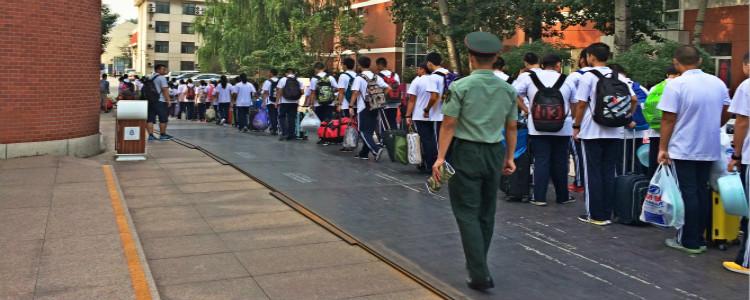 军训第一天起,附中校园便秩序井然。上午8点之前,全体高一新生在班主任和教官的组织下于教学楼前集结完毕,由教官统一带队入住学生宿舍。