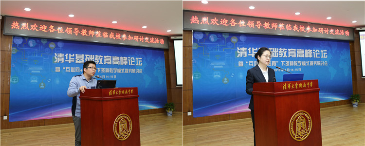 皇冠体育物理教师潘天俊(左)、教学管理与研究中心主任朱培做大会交流发言