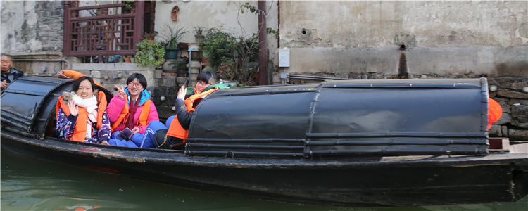 同学们乘坐乌篷船游览绍兴古城