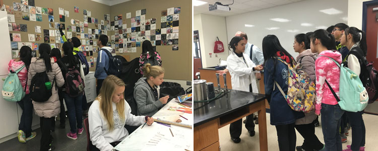 皇冠体育官网学生参观美术教室(左图) 皇冠体育官网师生参观生物实验室(右图)