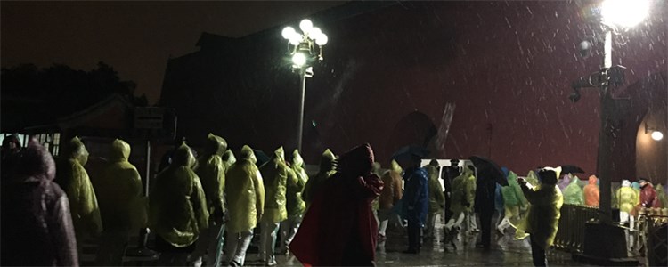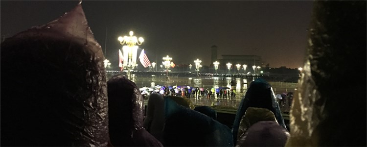 凌晨3点50分,各班学生和随班教师在附中校门口广场集合,学校为学生和老师发放了雨衣,众人乘坐大巴车前往天安门广场。凌晨4点50分到达目的地,由于天气原因,老师组织孩子们在车内等候。凌晨6点,各班学生在随班老师和现场工作人员的指挥下秩序井然地通过安检,登上观礼台。