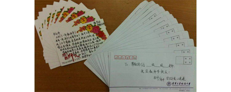 除“感念师恩”爱心献花活动外,教师节前,初中、高中学生会精心组织、周密安排,举办了专门替广大学生传递教师节祝福的“感念师恩 情谊速递”活动。初中、高中学生会首先于食堂与高中部教学楼前设置摊点,为同学们发放事先准备好的爱心贺卡,在收集完同学们对老师的温暖祝福后,于教师节当日准时派发。同学们用自己最真挚诚心的语言献给老师们最真切温暖的祝福,以此报答老师们对自己的谆谆教导、时刻关怀。同时,还于教学区展板、教师节庆祝活动现场等地布置了自己精心设计的感恩海报。