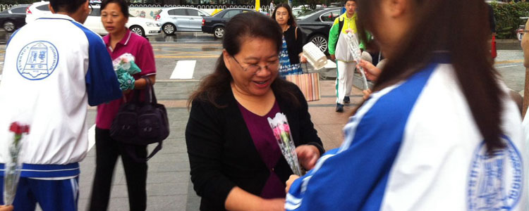 9月10日清晨,初中、高中学生会成员们统一着装、精神饱满,分别守候在学校西大门、小南门、汽车入校口处三个工作点。同学们手握充满浓情的康乃馨,满怀着激动心情,向辛苦工作的老师们献上一支支美丽的鲜花,并祝福老师们节日快乐。老师们在接收到同学们的祝福后深切地感受到附中学子们的拳拳感恩之心与深深爱戴之情,体会到作为人民教师的幸福感与快乐感。