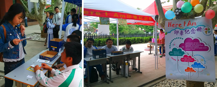 “Here I am!印章纪念册”是今年学生节的一项新尝试,旨在进一步宣传学生节中的活动,并指引游客参观游览。每一个参与了此项活动的班级、社团或学校主题活动在折页上有自己盖章的位置,还有一个风车挂在摊位作为标志。