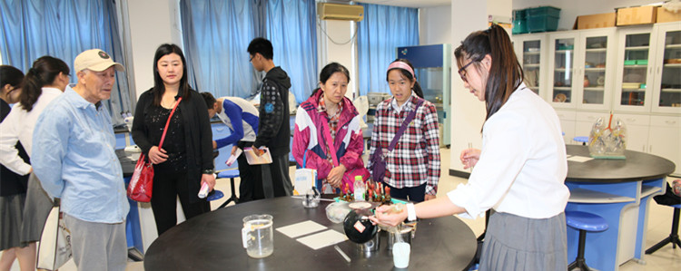 皇冠体育学生(右1)正在实验室为参观的家长和学生演示化学实验
