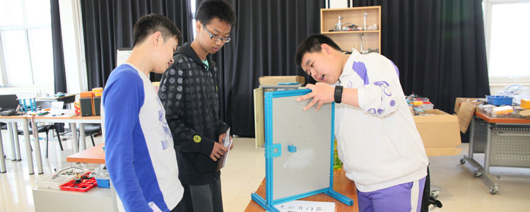皇冠体育学生(右1)正在创客空间为参观的学生讲解