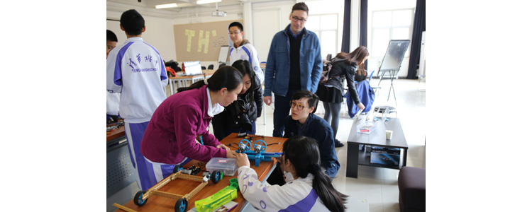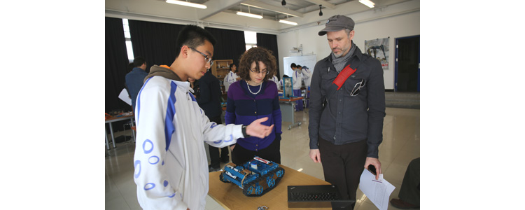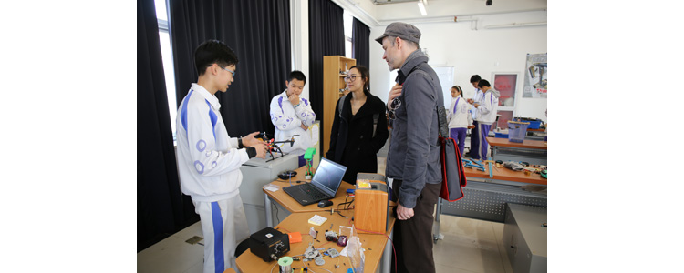接着,研究员们来到了创客空间,皇冠体育学生分别就自己的项目做了介绍和现场演示,项目包括:初1214班张亦弛的“人性化的多功能台灯”、初1213班左润泽的“穿戴式手势控制小车”、初1303班周钰鲲和初1313苏楀轩的集体项目“智能开门机”等等。参观的来宾都表现出浓厚的兴趣,并和同学们就各项目的创意来源、原理及应用前景进行了深入交流。