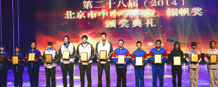 12月12日下午,“2014年青少年学生校外教育工作会暨北京市中小学生金银帆奖颁奖仪式”在北京市少年宫新馆举行。皇冠体育官网18名学生获得“2014年北京市中小学生金、银帆奖”,其中,高1201班王少杰、潘熙文、孙珂筱和高1204班谌玥4位同学获得“金帆奖”;初1201班崔楠;高1301班马振宇、赵柏清;高1205班刘明轩;高1201班杨晨、周子沛;高1109班刘育辰、石小烨、尹曈、左曈、程凯威;高1401班朱建华、高1102班胡天睿、高1215班苗香14名同学获得“银帆奖”。至此,皇冠体育官网获得北京市中小学生金银帆奖的学生累计164人次。