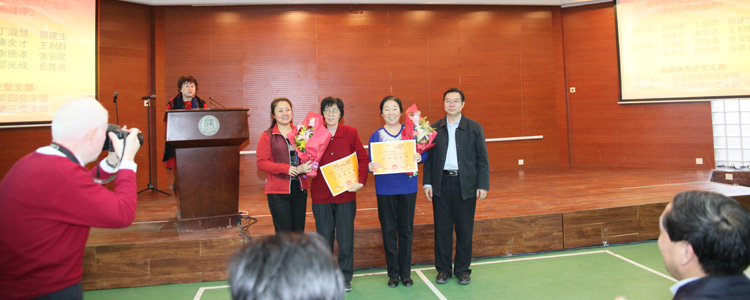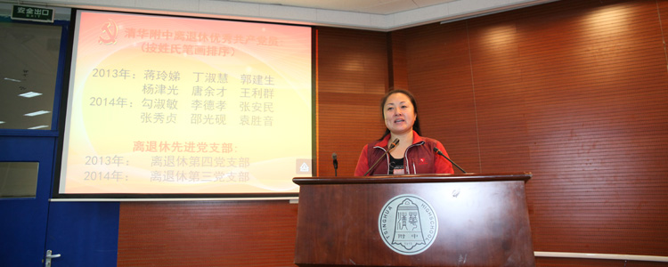 附中党委书记方妍宣读2013、2014两年受表彰的离退休教工优秀党员和先进党支部名单,与会领导为获奖集体和个人颁奖。