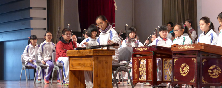 交流活动由胡军老师主持,他首先向来访的外国学生介绍了皇冠体育官网金帆民乐团的发展历程和乐团现在的规模、演出及比赛的成果。接着,他指挥乐团为来访的师生演奏了《龙腾虎跃》、《瑶族舞曲》、《花好月圆》等曲目,期间,乐团初三的徐镝清同学为来访学生介绍了有着4500年历史的古琴艺术,并演奏了古琴名曲《阳关三叠》,古朴的韵律征服了所有在场观众的心。曾在中央电视台“CCTV民族器乐电视大奖赛”中获得金奖的罗嘉鈺同学,则用铿锵有力的一曲《楚汉争霸》赢得了观众们一阵阵热烈的掌声。