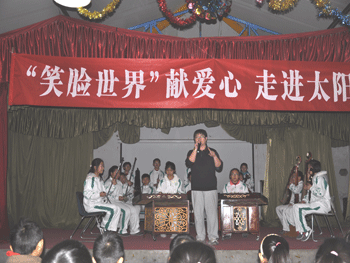 乐团初一学生在参观、了解“太阳村”之余,还在胡军老师的指挥下,为太阳村78名小朋友和100余名爱心市民表演了民乐合奏《龙腾虎跃》及《花好月圆》,同学们精彩的表演,赢得了到场观众热烈的掌声。