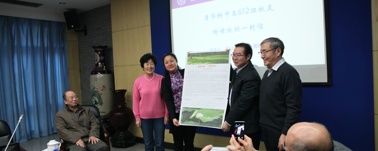 王殿军(右2)、方妍(左2)接收《高612班校友给母校的一封信》(高岷 摄影)