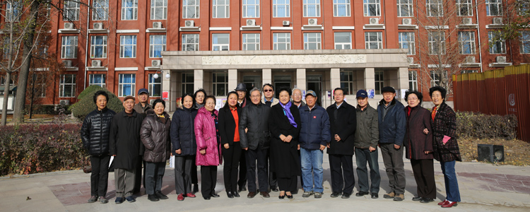 会谈结束后,高612班全体校友回到当年上课的教学楼前合影留念。校领导将印有此教学楼门楣浮雕画的卷轴纪念品送给校友们。