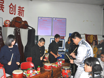 唐逸时同学教日本学生进行中国鼓的演奏 中日学生合影留念
