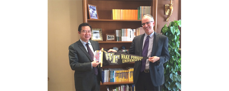 王殿军校长(左)和维克森林大学教务长Dr.RoganKersh互赠纪念品(张晶粒 摄影)