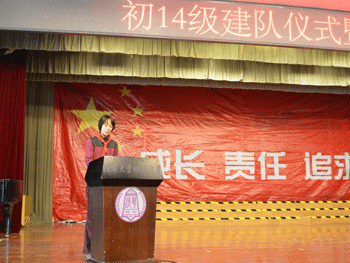 在建队仪式上,少先队辅导员于洺任命并宣布各中队辅导员老师以及各中队和联合中队的中队委名单,并向各中队授中队旗。各中队委向到场嘉宾与辅导员老师献上鲜艳的红领巾,表达了同学们对老师的感谢与敬意。少先队员代表宇家慧同学发言,带领大家回忆了进入中学学习以来的点滴,呼吁同学们以严格的标准要求自己,积极向团组织靠拢。学生发展中心主任郎艳老师在发言中为初一的同学们提出了要求,勉励同学们迈好中学第一步,努力学习,积极进步。