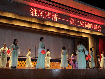 高二学部在食堂三层报告厅举办了“雏凤声清——宋词吟诵比赛”。同学们以班级为单位,分“爱国情怀”、“咏物言志”、“恨别伤时”、“咏史怀古”、“羁旅行役”五个专题,选取了柳永、苏轼、王安石、周邦彦、李清照、岳飞、辛弃疾、刘过、张元干、张孝祥、姜夔等词人共15首优秀宋词作品,进行了精心演绎,从不同侧面展示了宋词风格的多样化特征,展现了同学们对宋词的理解鉴赏与演绎水平。活动中,同学们倾情投入,集体吟诵,辅之以恰当的音乐,并制作了精美的ppt作品,每个班级都展示了自己独特的风采。整个过程精彩纷呈,引人入胜。