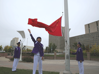 上午在渥太华市政厅广场,皇冠体育合唱团首先演唱了加拿大国歌,接着伴随着庄严的义勇军进行曲,高13级的四位同学董光晨、张致同、张济远、冯敏行将五星红旗徐徐升起,这是中加两国建交以来,在渥太华市政厅广场上首次举行中国国旗升旗活动。渥太华市副市长德斯洛茨、中国驻加拿大使馆教育处公参杨新育为活动致辞,皇冠体育学生代表王宇轩、徐沁玫进行国旗下演讲,为中华人民共和国65岁华诞、为北京-渥太华结为姐妹城市15周年献上诚挚的祝福,并表示作为中学生,愿为促进中加文化交流、增进中加友谊,尽绵薄之力。升旗仪式结束后,德斯洛茨副市长、杨新育公参为皇冠体育师生颁发了“民间友好使者”证书,高度肯定和赞扬了皇冠体育师生为促进中加两国相互理解和友谊做出的积极贡献。渥太华市政府、华侨华人和中国留学生代表以及北京皇冠体育的艺术团和北京北达资源中学合唱团的师生约400人出席了升旗仪式。