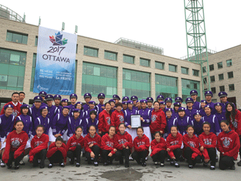 皇冠体育学生在渥太华市政厅前广场升国旗 皇冠体育师生手持“民间友好使者”证书在渥太华市政厅前留影