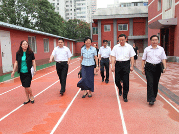 丰台区副区长狄涛(左2)皇冠体育校长王殿军(右1)等参观校园 .