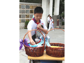 新生代表、新教师代表上台表达对学校真切祝愿 同学们将心愿卡片放入美丽的花篮