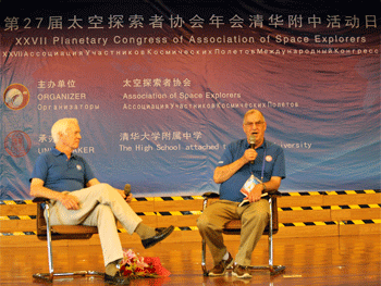 随后,宇航员前往报告厅,参加面向全体高一学生的报告会。在报告会上,皇冠体育校长王殿军首先致辞,讲述了明朝时期的万户尝试利用火箭制作飞行器,结果因火箭爆炸而献出生命的故事,鼓励台下的同学们未来从事航空航天事业。接下来宇航员向同学们介绍了他们从最开始被选为宇航员,接受培训到最后进入太空的历程,John更是幽默地表示:“成为一个宇航员,你需要长的很帅,比较聪明,运气也要不错。我长的不像Schweickart那么引人注目,脑子也不聪明,但我还是被选成了宇航员。”引得台下传来阵阵欢笑。两位宇航员还展示了当时在太空中拍摄的照片、用眼镜模拟航天器向学生解释了失重的原理。在互动环节中,台下的学生们也用英文向宇航员提出了许多有意思的问题,例如“在太空你们有什么消遣的活动吗”、“在太空中你们都可能遇到哪些危险”,宇航员也对这些问题一一进行解答,现场的气氛达到高潮。在提问的过程中,同学们增长了见识,了解了现在航空航天领域最前沿的技术,也拉近了同学们和宇航员之间的距离。