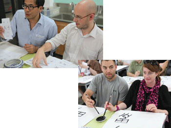 活动围绕“如何将中国文化融入到中文教学中”的核心问题展开。八位中文老师用中英文分别从创设富有中国文化特色的教室环境,中国古典诗歌的重要地位、中国古典诗歌在对仗和节奏上表现的音乐美,中国文字的演变和书法的魅力等几方面进行了讲解与展示。在整个活动的过程中,伴随着《渔舟唱晚》的美妙音乐,外教们时而在问答中沉浸于中国古典诗歌的情蕴之美,时而在游戏中臣服于古典诗歌的对仗之美,时而在击鼓诵读中惊叹于《笠翁对韵》的节奏之美,时而在泼墨挥毫中尽享中国文字和书法的变幻之美。而在课堂展示结束之后,结合中国传统端午节的到来,全体教职员工还去教师休息室参加了中文组精心准备的小型端午文化宴。在屈原故事的娓娓讲述以及包粽子的亲身体验中,全体教师意犹未尽地结束了当天的中国文化之旅。
