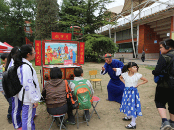 副校长解巨钊让艺术家彩绘脸谱 学生和家长在观看拉洋片艺术