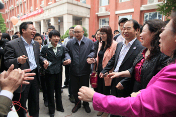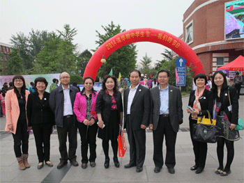 领导嘉宾观看学生节文艺演出 领导嘉宾在学生节拱门前合影