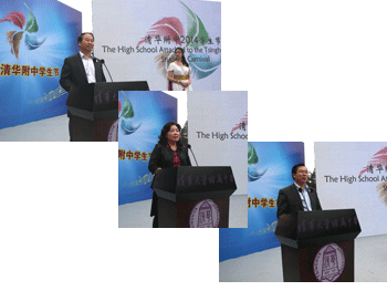领导嘉宾体验通电的感觉 王定华司长(左上)、尹丽君主任(中)、王殿军校长分别致辞