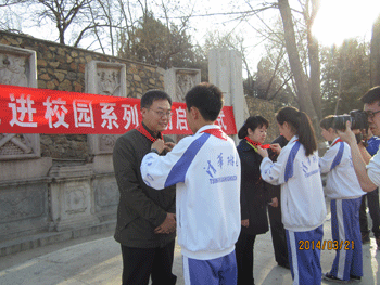 圆明园党委王书记(右)向附中捐赠图书 附中学生代表给领导佩戴红领巾
