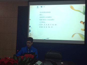 随后,辛颖主任与参会学生干部针对以上两位同学提出的问题进行讨论并做了下一步的工作安排,同时她对同学们的工作提出了几点希望,一、精心策划、分工明确、提高工作效率;二、既要传承又要勇于创新;三、崇尚节俭,提高资源利用率。