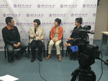 袁秀芝老师(左2)接受学生马跃航(左1)李金芝(右1)王丽萍(右2)采访 高81级1班班主任瞿宁远(中)接受学生罗青(左)马政(右)采访
